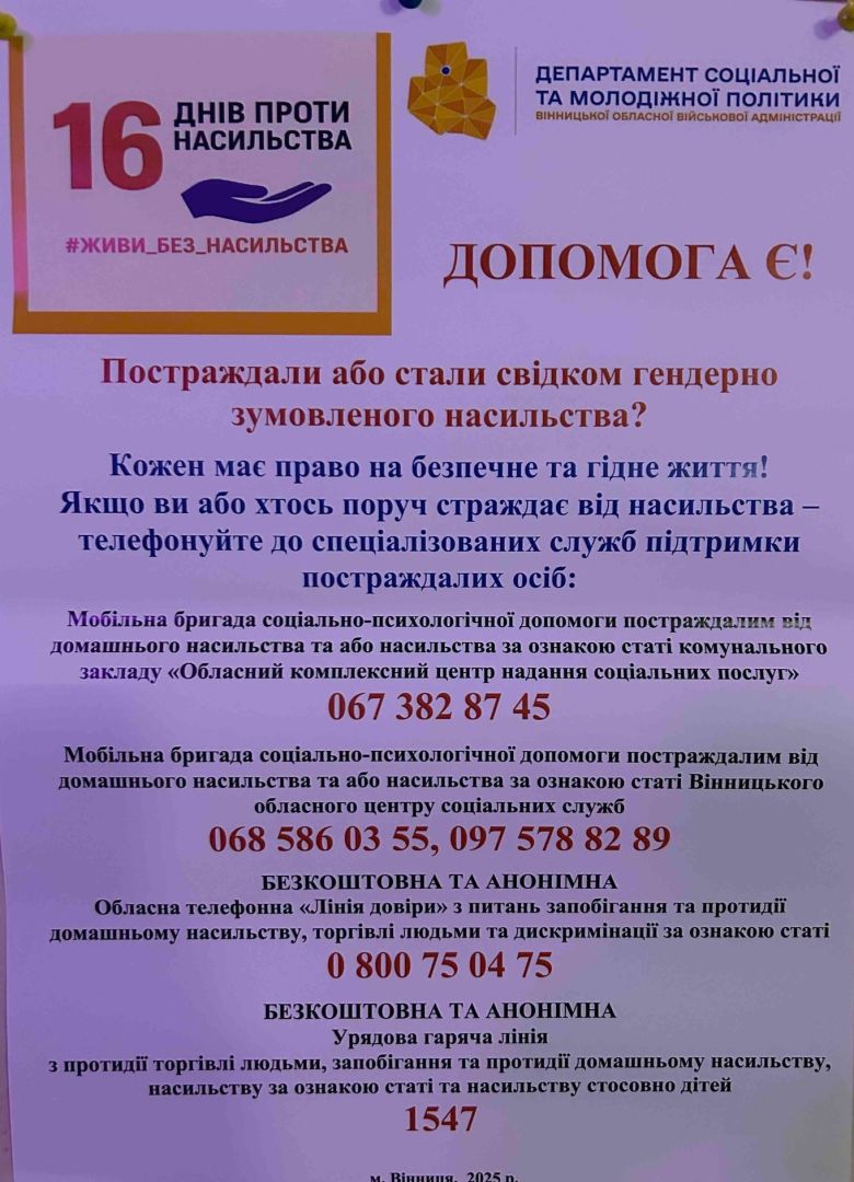 У межах щорічної всесвітньої акції «16 днів проти насильства», що триває з 25 листопада по 10 грудня, в Іллінецькому коледжі були проведені тематичні виховні години зі студентами. Під час зустрічей обговорювалися основні види насильства, способи його розпізнавання та інформація про те, куди можна звернутися по допомогу, якщо виникає потреба. Організували та провели ці важливі заходи практичний психолог Інна Інгульська та соціальний педагог Людмила Буркало, які допомогли студентам глибше зрозуміти проблему та усвідомити важливість вчасного звернення по підтримку. Мета зустрічей — розірвати коло мовчання, підвищити обізнаність молоді та наголосити, що ніхто не повинен залишатися наодинці у складних ситуаціях.