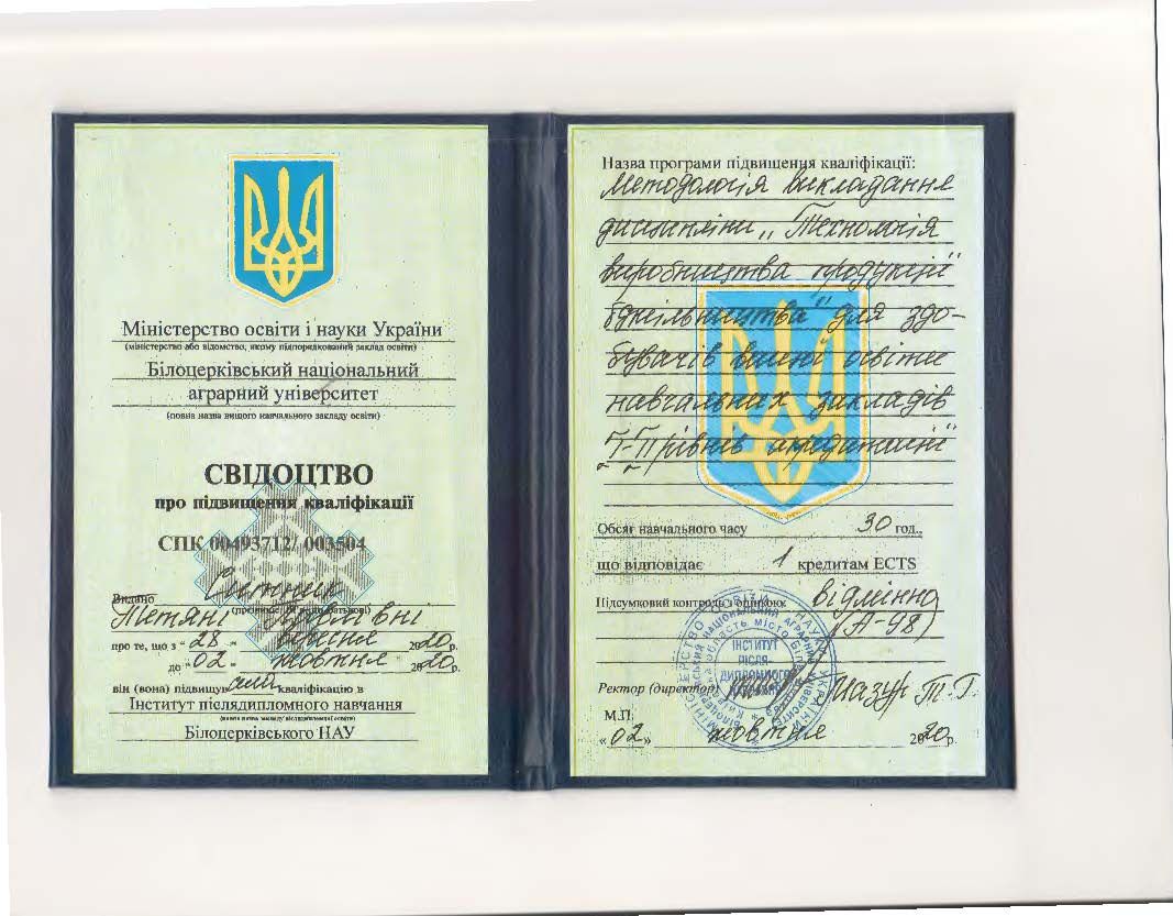 - Білоцерківський НАУ, Інститут післядипломного навчання БНАУ. Свідоцтво № СПК 00493712/003504 від 02.10.2020.
