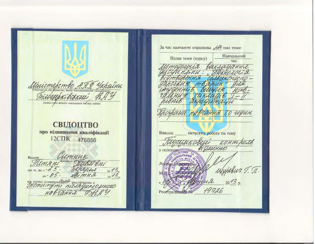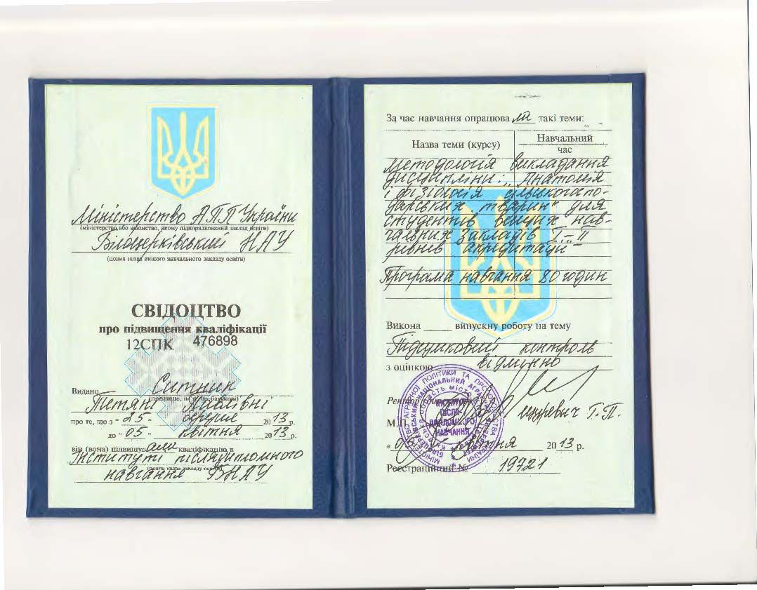 - Білоцерківський НАУ, Інститут післядипломного навчання БНАУ. Свідоцтво №12 СПК 476856 від 05.04.2013.