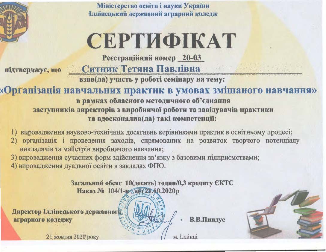 - Сертифікат Іллінецького державного аграрного коледжу, “Організація навчальних практик в умовах змішаного навчання” в рамках обласного методичного об’єднання заступників директорів з виробничої роботи та завідувачів практики. 10 годин/0,3 кредиту ЄКТС від №104/1-к від 21.10.2020.