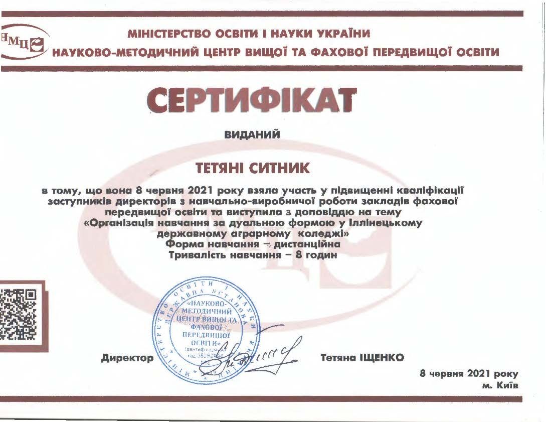 - Сертифікат Науково-методичного центру вищої та фахової перед вищої освіти на тему: “Організація навчання за дуальною формою у Іллінецькому державному аграрному коледжі” (8 годин) від 08.06.2021.