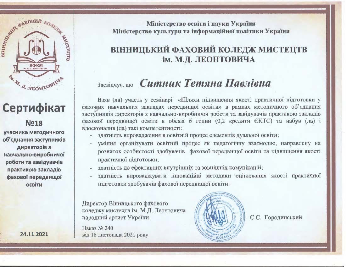 - Сертифікат учасника методичного об’єднання заступників директорів з навчально-виробничої роботи та завідувачів практикою закладів фахової передвищої освіти на тему: “Шляхи підвищення якості практичної підготовки у фахових навчальних закладах перед вищої освіти” (6 годин/0,2 кредити ЄКТС) від 18.11.2021.