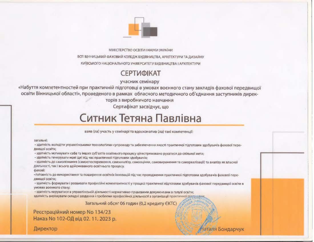 - Сертифікат ВСП Вінницький фаховий коледж будівництва, архітектури та дизайну Київського національного університету будівництва і архітектури на тему: “Набуття компетентностей при практичній підготовці в умовах воєнного стану закладів фахової перед вищої освіти в Вінницькій області” обласне методичне об’єднання заступників директорів з виробничого навчання (6 годин/0,2 кредити ЄКТС) від 02.11.2023.
