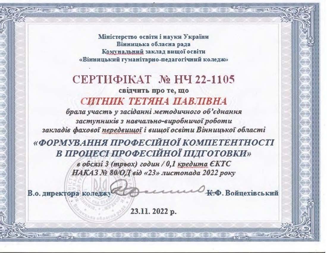 - Сертифікат комунальний заклад вищої освіти “Вінницькогуманітарно-педагогічний коледж” на тему: “Формування професійної компетентності в процесі професійної підготовки” (3 години/0,1 кредити ЄКТС) від 23.11.2022.