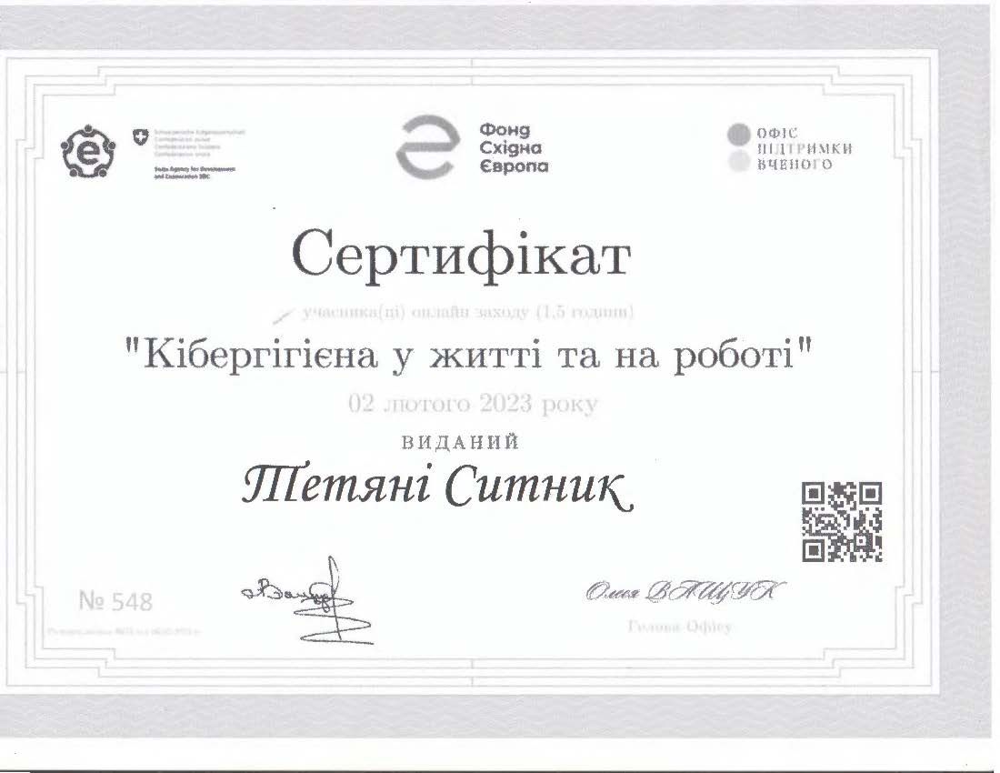 - Сертифікат учасника на тему: “Кібергігієна у житті та на роботі” (1,5 години) від 02.02.2023.