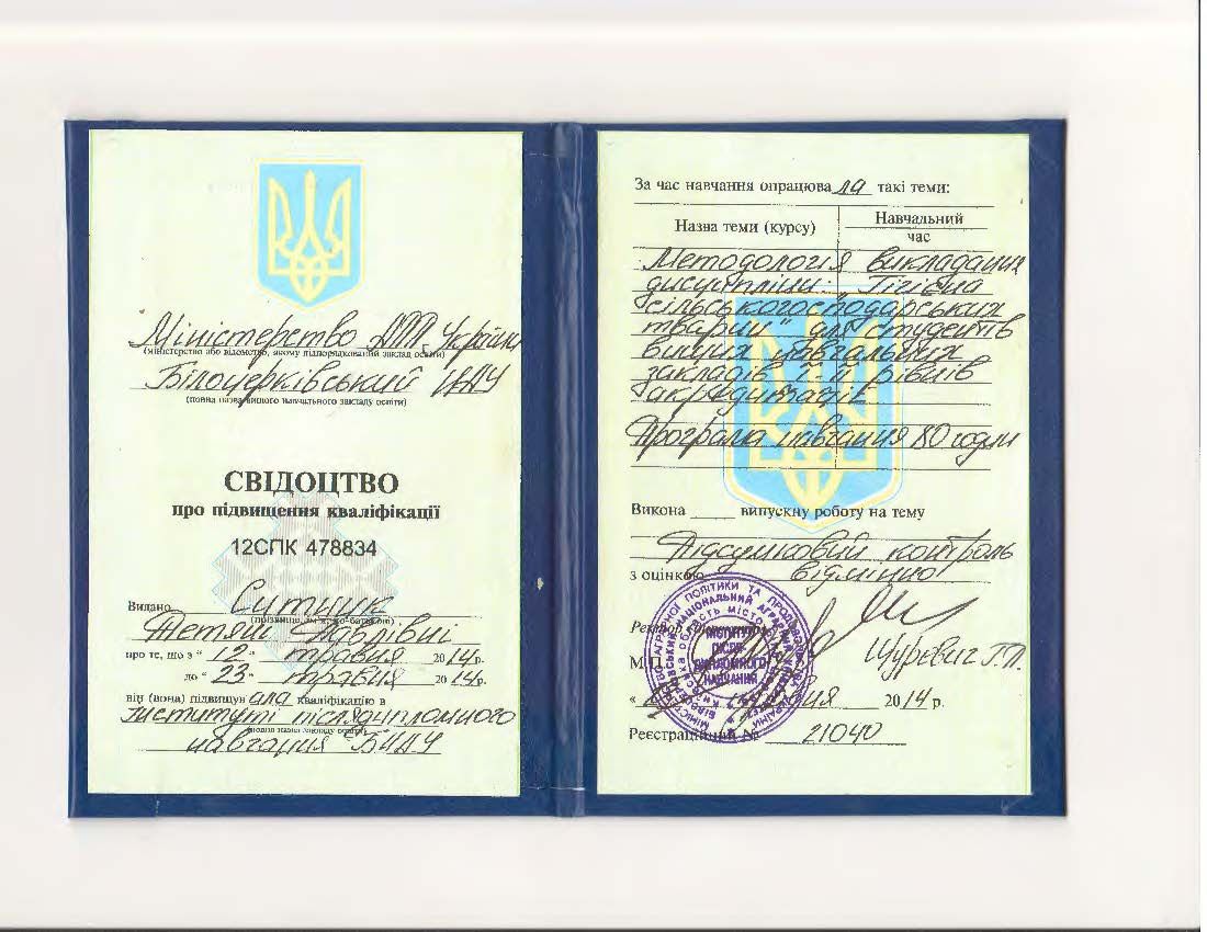 - Білоцерківський НАУ, Інститут післядипломного навчання БНАУ. Свідоцтво №12 СПК 478834 від 23.05.2014.