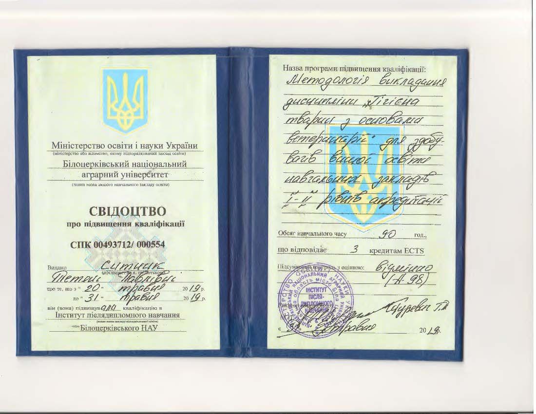 - Білоцерківський НАУ, Інститут післядипломного навчання БНАУ. Свідоцтво № СПК 00493712/000554 від 31.05.2019.