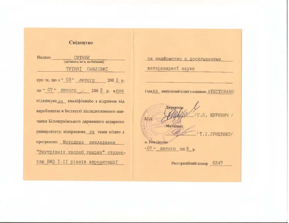 - Білоцерківський державний аграрний університет, Інститут післядипломного навчання. Свідоцтво № 6347, від 07.02.2003.