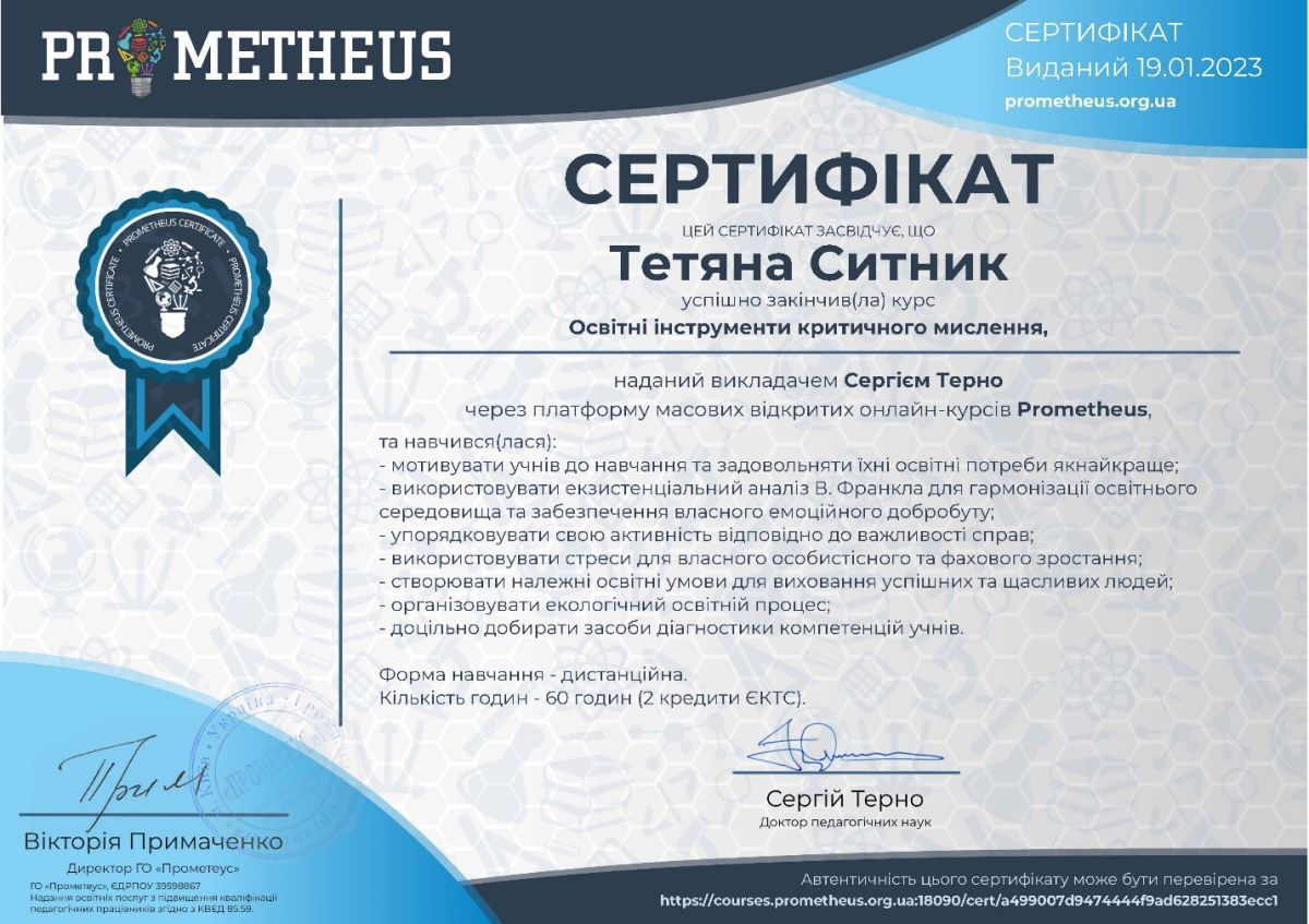 - Сертифікат Prometheus про успішне завершення навчання на тему: “Освітні інструменти критичного мислення” (60 годин/2 кредити ЄКТС) від 19.01.2023.
