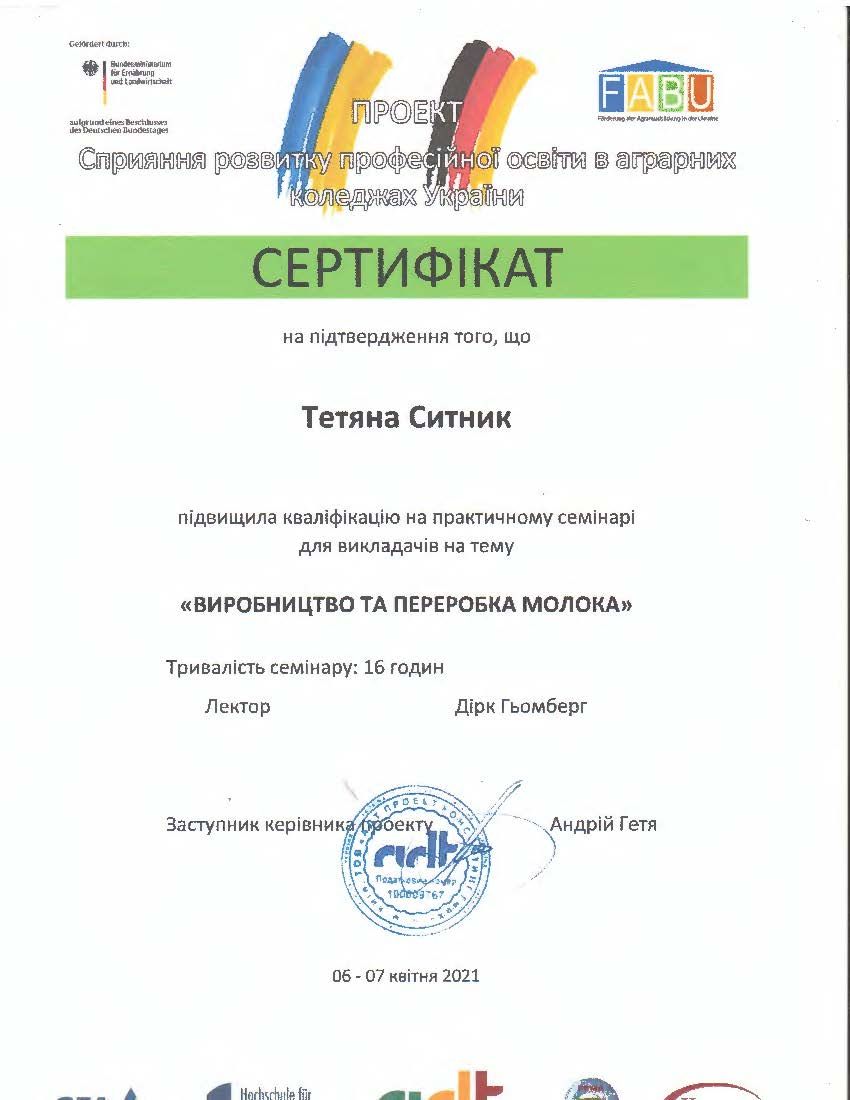 - Сертифікат Проекту сприяння розвитку професійної освіти в аграрних коледжах України, підвищення кваліфікації “Основи виробництва якісного молока” (12 годин) від 25-26.05.2021.