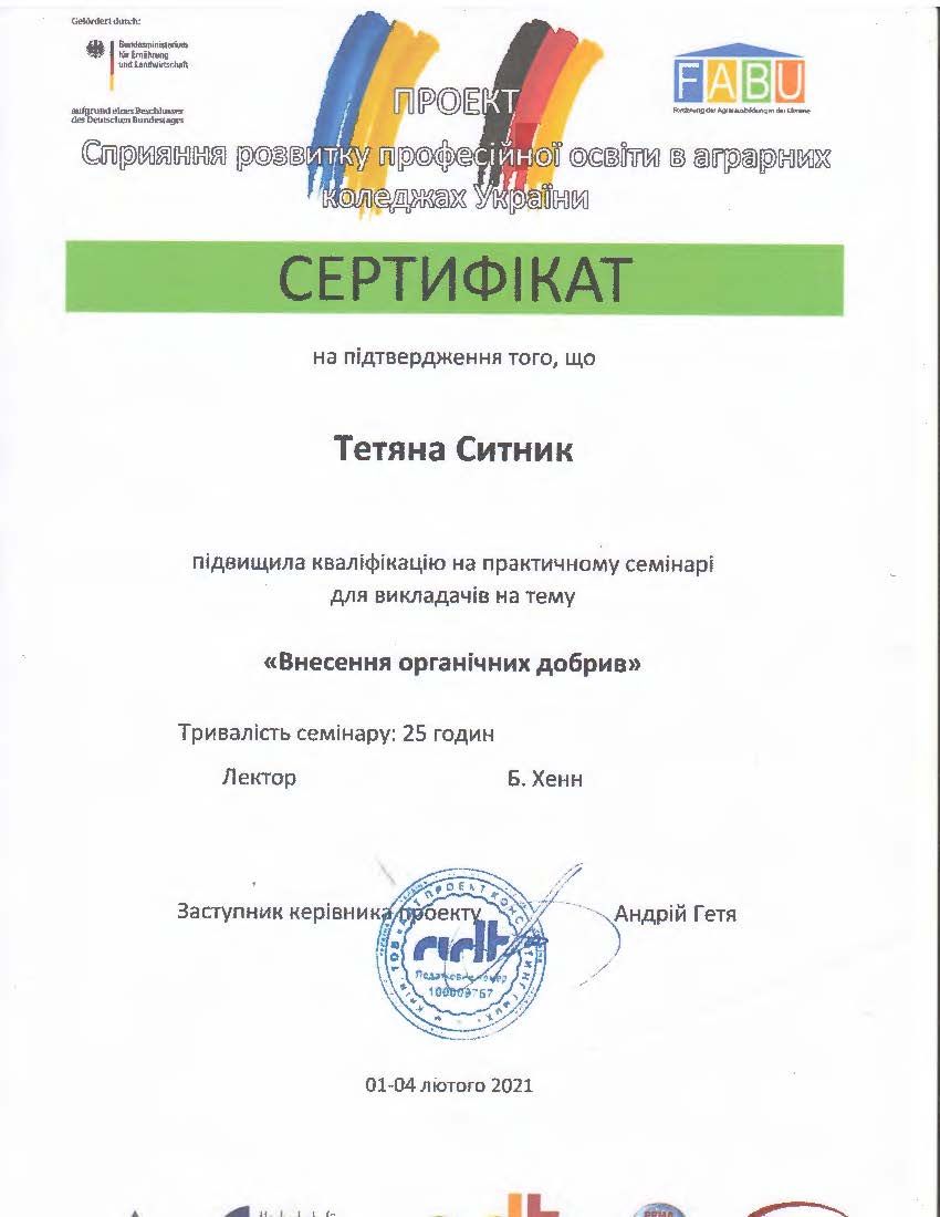 - Сертифікат Проекту сприяння розвитку професійної освіти в аграрних коледжах України, підвищення кваліфікації “Внесення органічних добрив” (25 годин) від 01-04.02.2021.