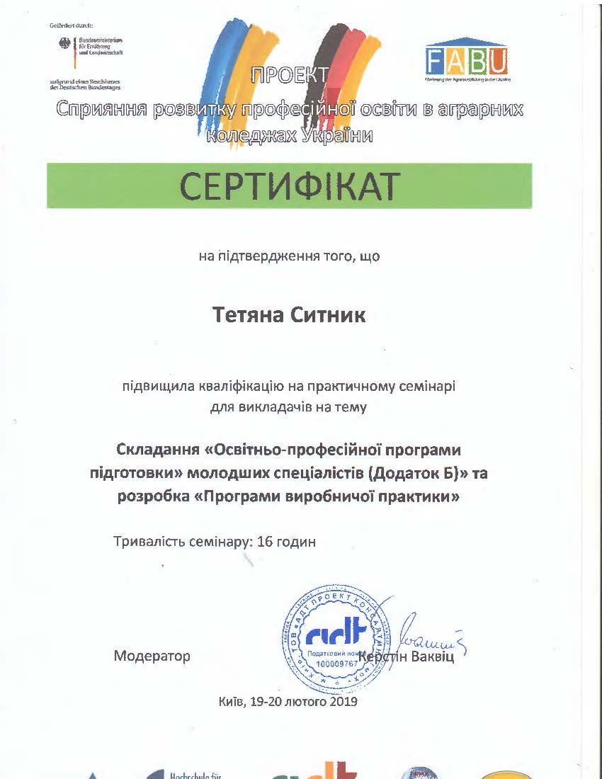 - Сертифікат Проекту сприяння розвитку професійної освіти в аграрних коледжах України, підвищення кваліфікації: складання “Освітньо-професійної програми підготовки” молодших спеціалістів та розробка “Програми виробничої практики” (16 годин) від 19-20.02.2019.
