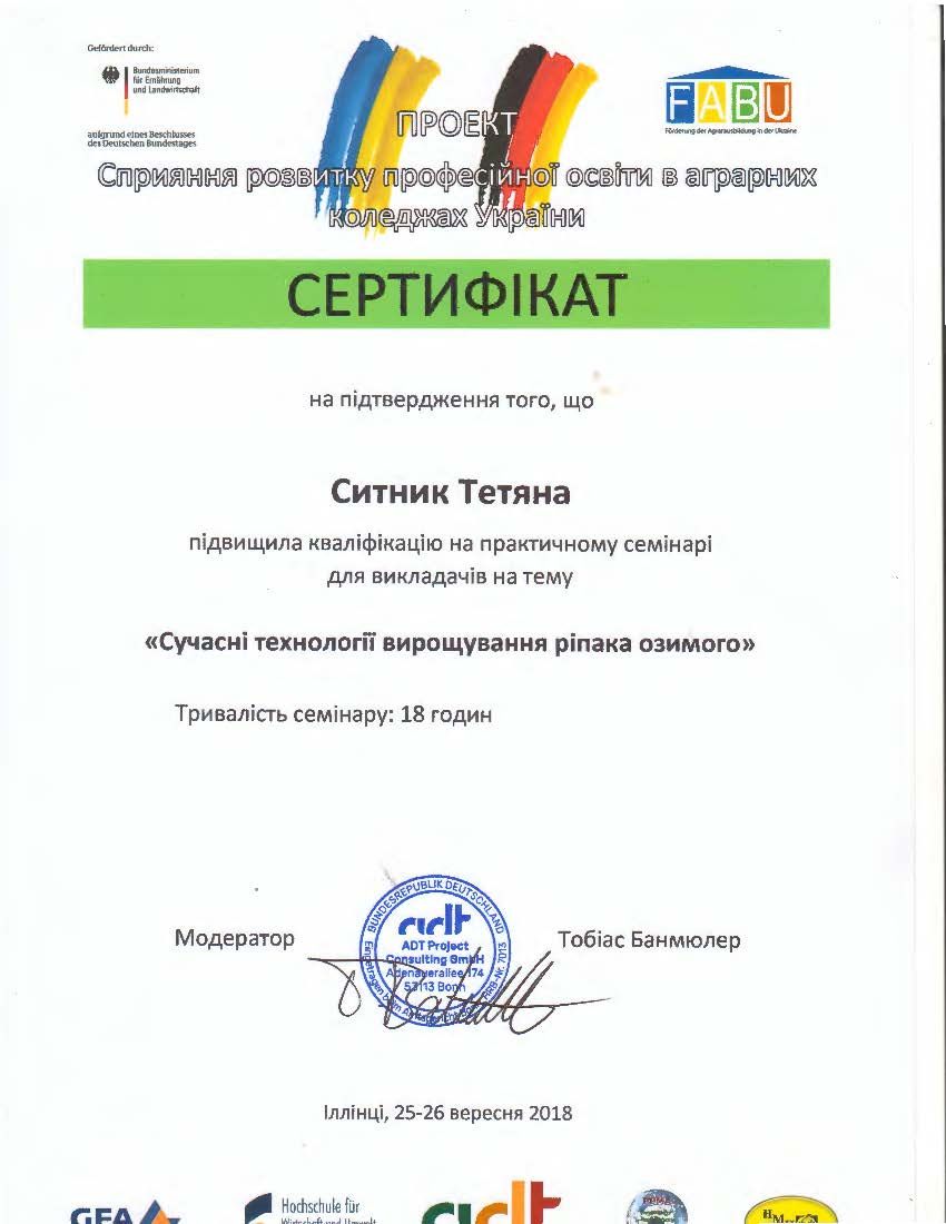 - СертифікатПроекту сприяння розвитку професійної освіти в аграрних коледжах України, підвищення кваліфікації на практичному семінарі “Сучасні технології вирощування ріпака озимого” (18 годин) від 25-26.09.2018.