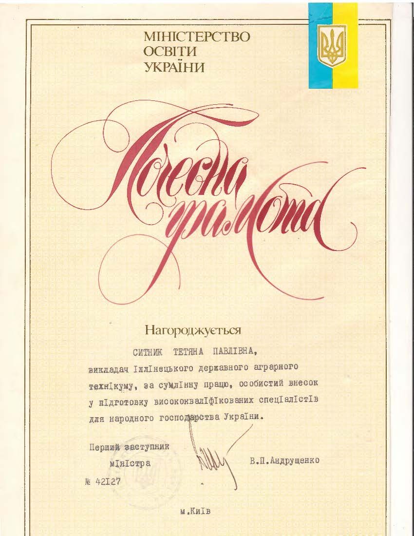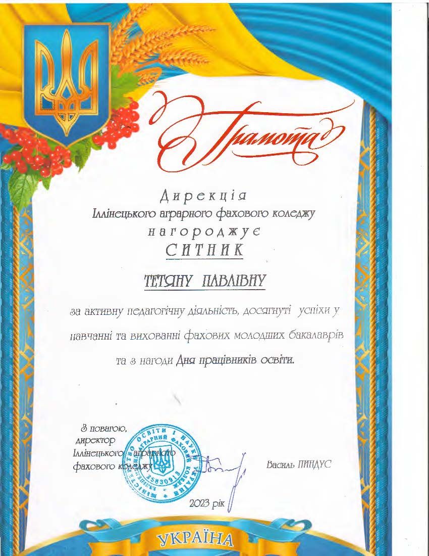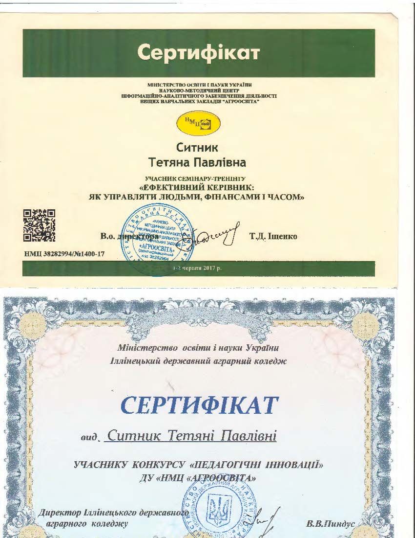 - Сертифікат Іллінецького державного аграрного коледжу “Педагогічні інновації ДУ “НМЦ Агроосвіта” №28-2017
