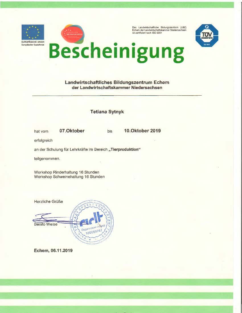 - Сертифікат Проекту сприяння розвитку професійної освіти в аграрних коледжах України, підвищення кваліфікації на практичному семінарі“Менеджмент відтворення ВРХ” (28 годин) від 17-20.09.2019.