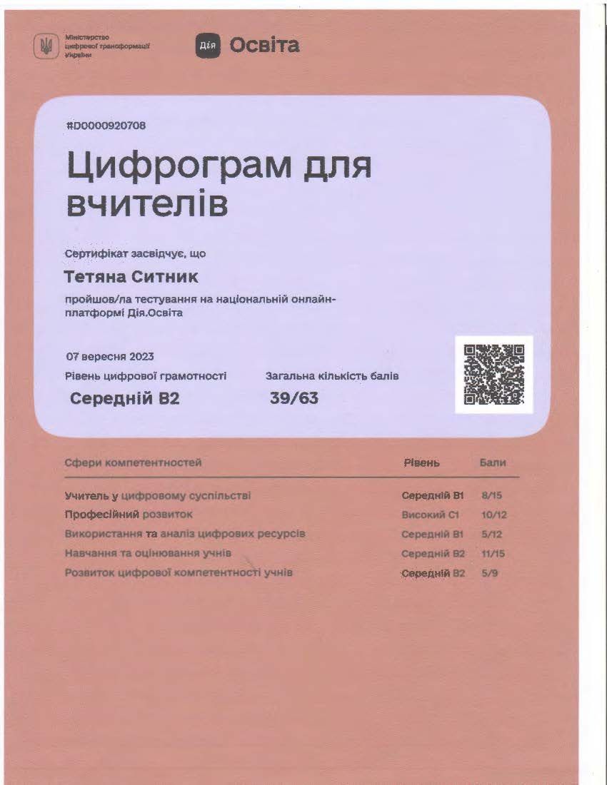 - Сертифікат Дія.Освіта – Цифрограм для вчителів на тему: “Рівень цифрової грамотності” від 07.09.2023.