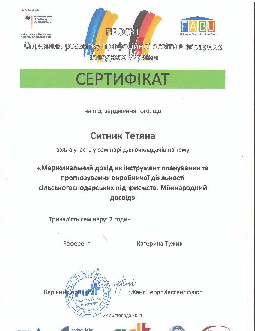 - Сертифікат Проекту сприяння розвитку професійної освіти в аграрних коледжах України, семінар на тему: “Маржинальний дохід як інструмент планування та прогнозування виробничої діяльності сільськогосподарських підприємств. Міжнародний досвід” (7 годин) від 22.11.2021.