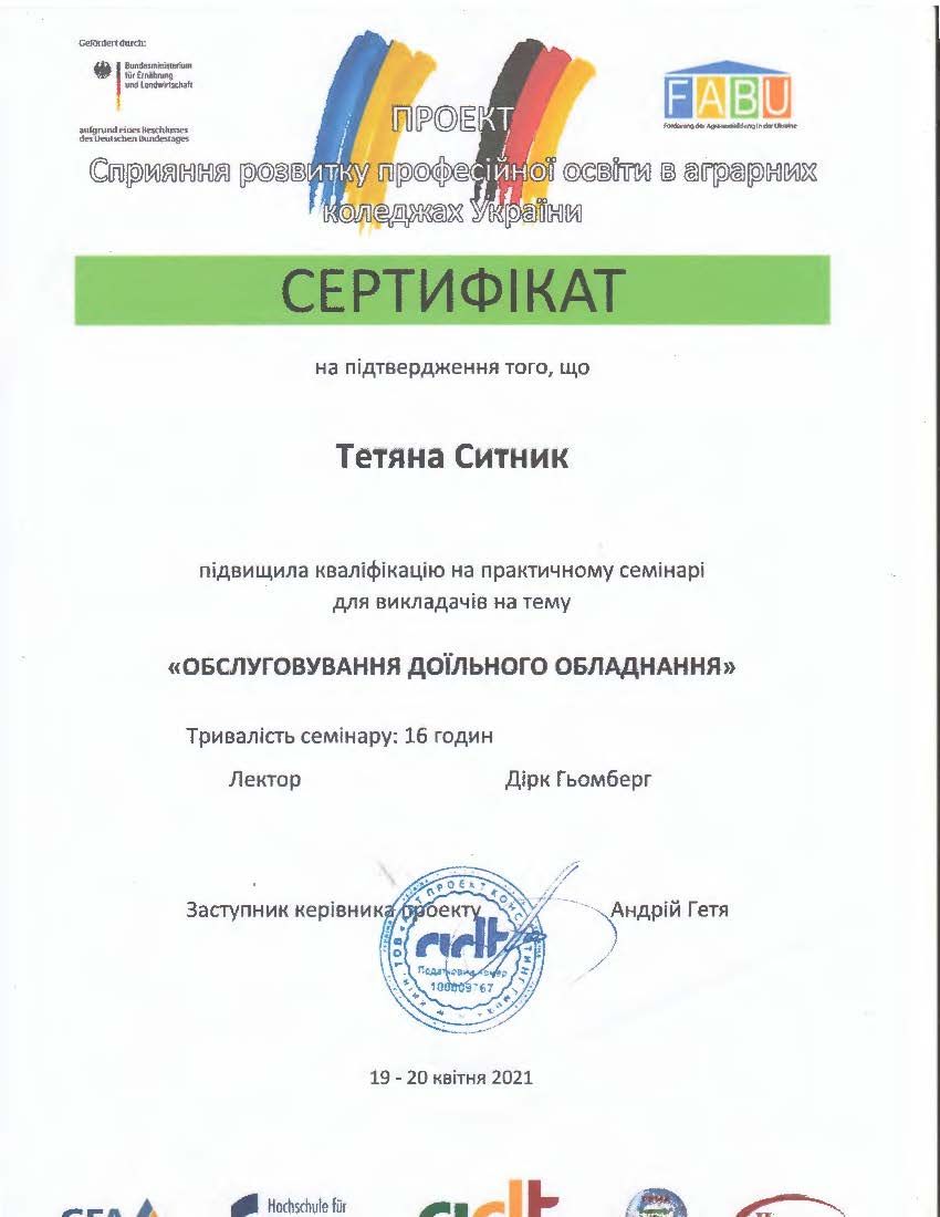 - Сертифікат Проекту сприяння розвитку професійної освіти в аграрних коледжах України, підвищення кваліфікації “Обслуговування доїльного обладнання” (16 годин) від 19-20.04.2021.